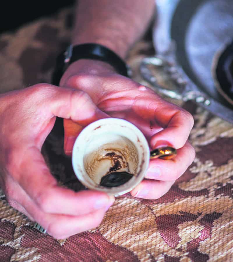 - Παίρνουμε το φλιτζάνι στα χέρια μας, και το γυρίζουμε κυκλικά – όπως κινούνται οι δείκτες του ρολογιού – ώστε να «ξεκολλήσουμε» το κατακάθι που έχει μείνει στον πάτο! Κάνουμε 3 κύκλους το φλιτζάνι.
